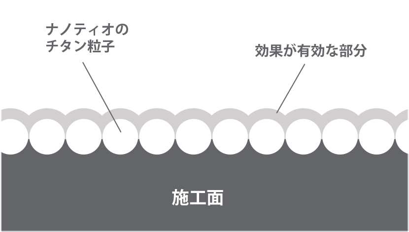 配合されているナノ酸化チタンに光が当たることで、 エネルギーを発生。酸素や水分と反応することで、菌や ウイルス、アンモニアなどを分解、不活化させる作用。 これまでの光触媒製品は光触媒作用を最大限に発揮 させることができませんでしたが、ナノティオツーは 新しい技術を採用することで、これを可能にしました。